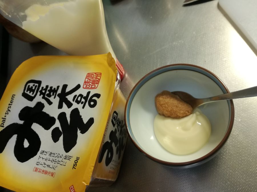- Miso, som er en soyabønne-pasta der bl.a. bruges som base for miso-suppe. Det kan typisk fås i asiatiske specialbutikker – og ellers kan man nøjes med en almindelig mayonnaise.