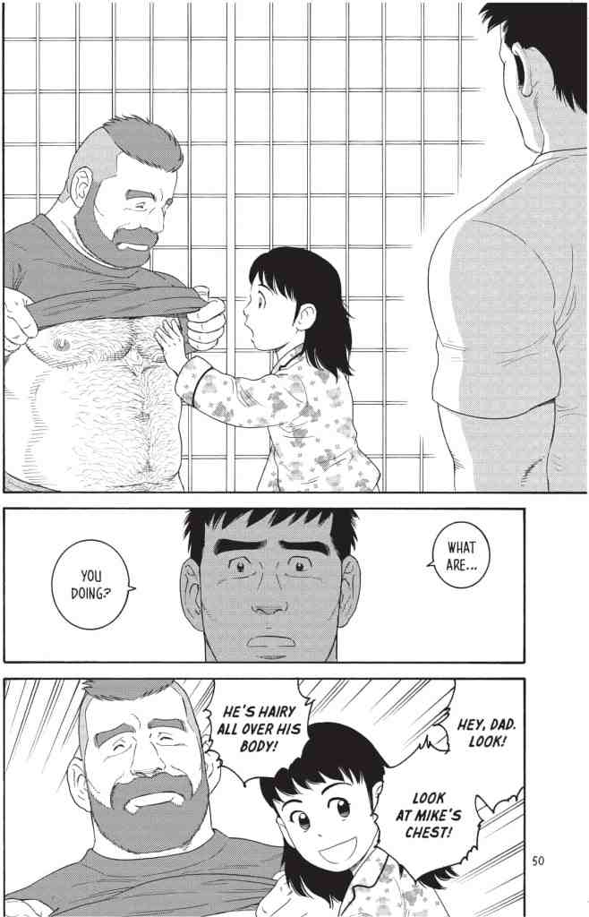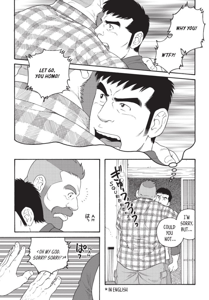 Og så er han selv homoseksuel, hvad der er tydeligt i hans tegninger af mænd og kvinder. Kvinderne er lidt kedelige, men de mandlige hovedpersoner Mike og Yaichi er et par flotte muskuløse fyre, der går rigtig meget i bad.