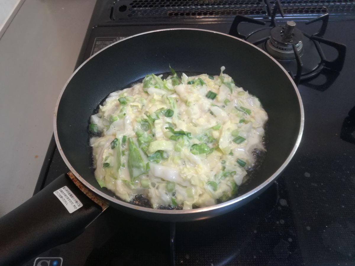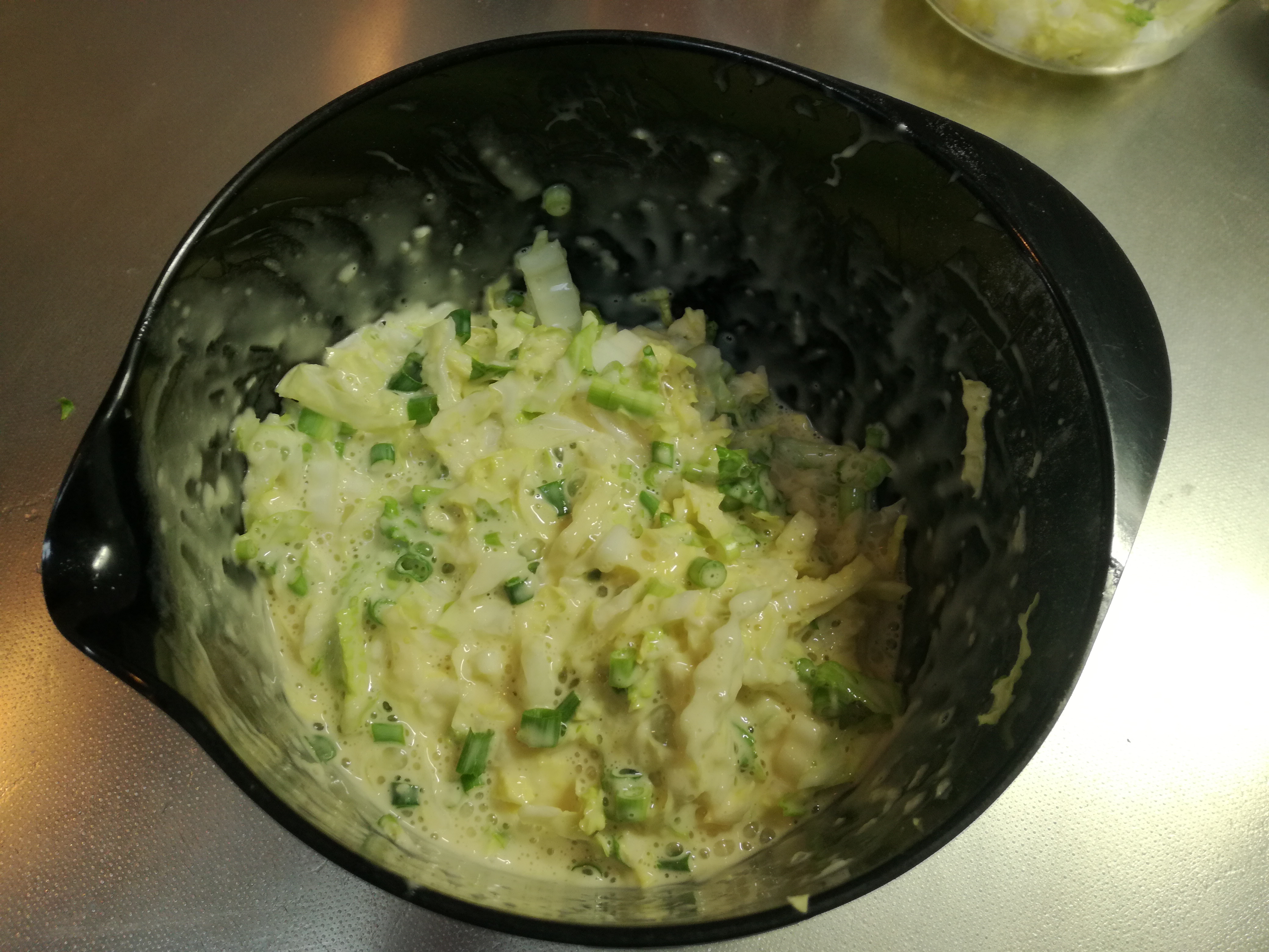 Kålen blandes i dejen, mens kød og skaldyr tilsættes under stegningen af de store, tykke, lækre pandekager.