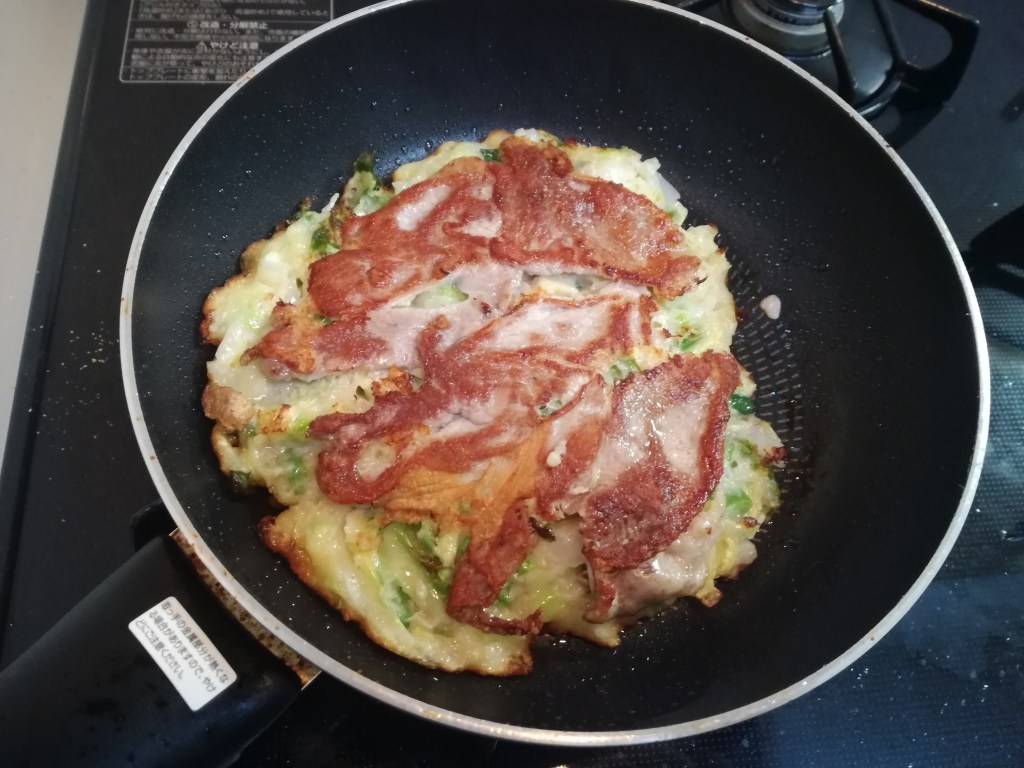I den her opskrift har jeg brug bacon, og tilsat revet nagaimo, en slags yams, i dejen. Nagaimo bliver til en klistret hvid substans når den rives, og giver retten noget stivelse. Det er en grøntsag der kan være svær at få fat på – tilsæt evt. en anden form for revet yams i stedet, eller bare lidt ekstra mel.