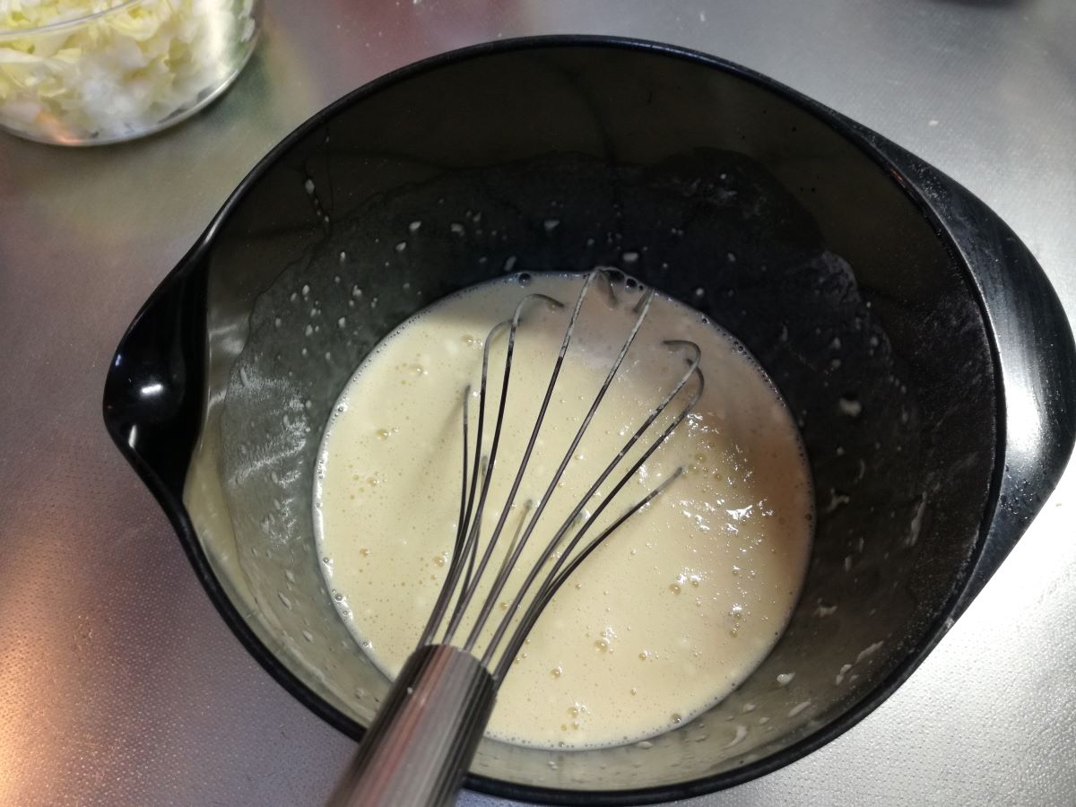- Pisk dashi og mel sammen i en røreskål, til dejen er glat.