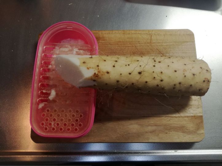 2. Tilsæt æg, revet nagaimo, salt og soya. Rør dejen glat igen.