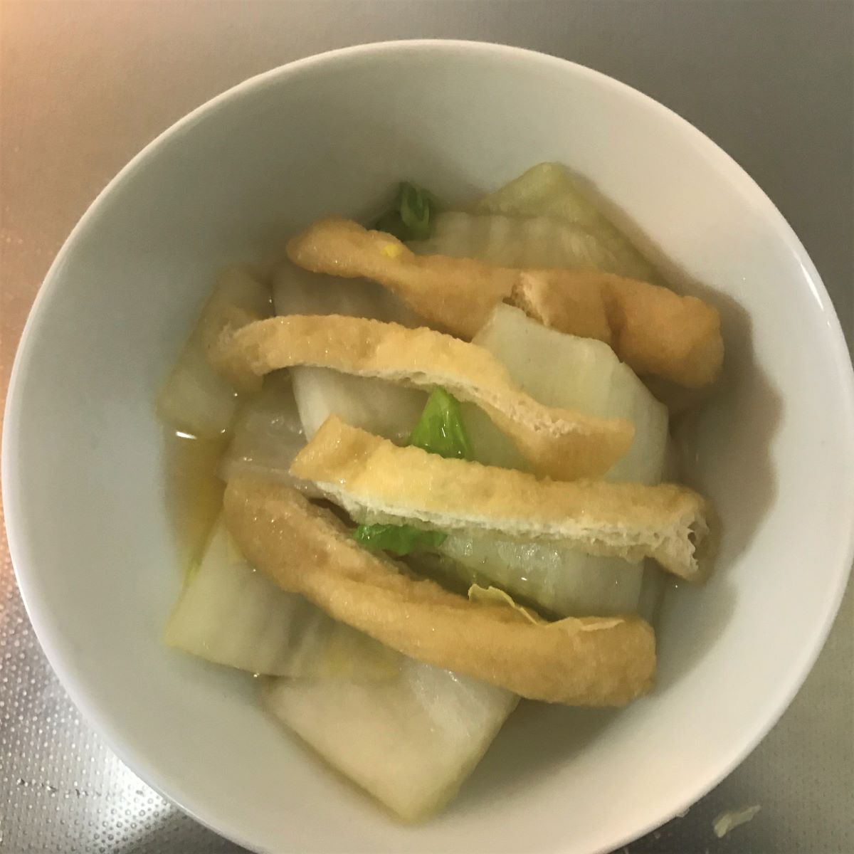 - Server kål og aburaage i en skål med suppen.